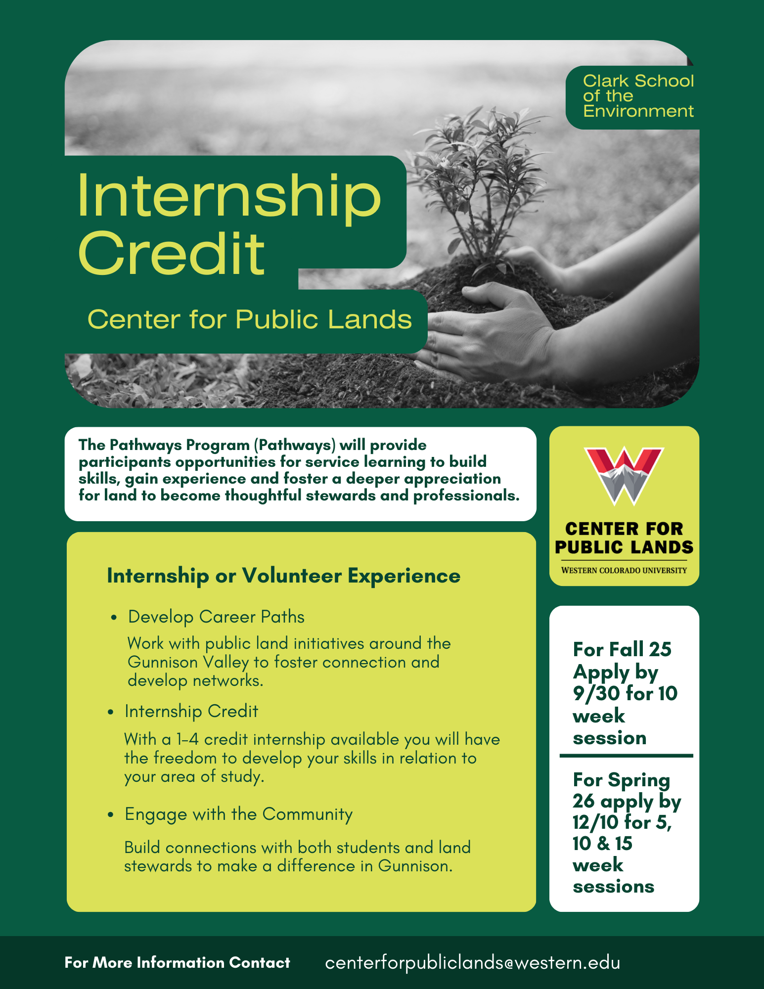 The Center for Public Lands is creating internship opportunities to provide undergraduates with hands-on experiences that connect them to meaningful careers in public lands and conservation. These internships aim to foster skills, networking, and job readiness in fields that protect and manage our natural resources for future generations.