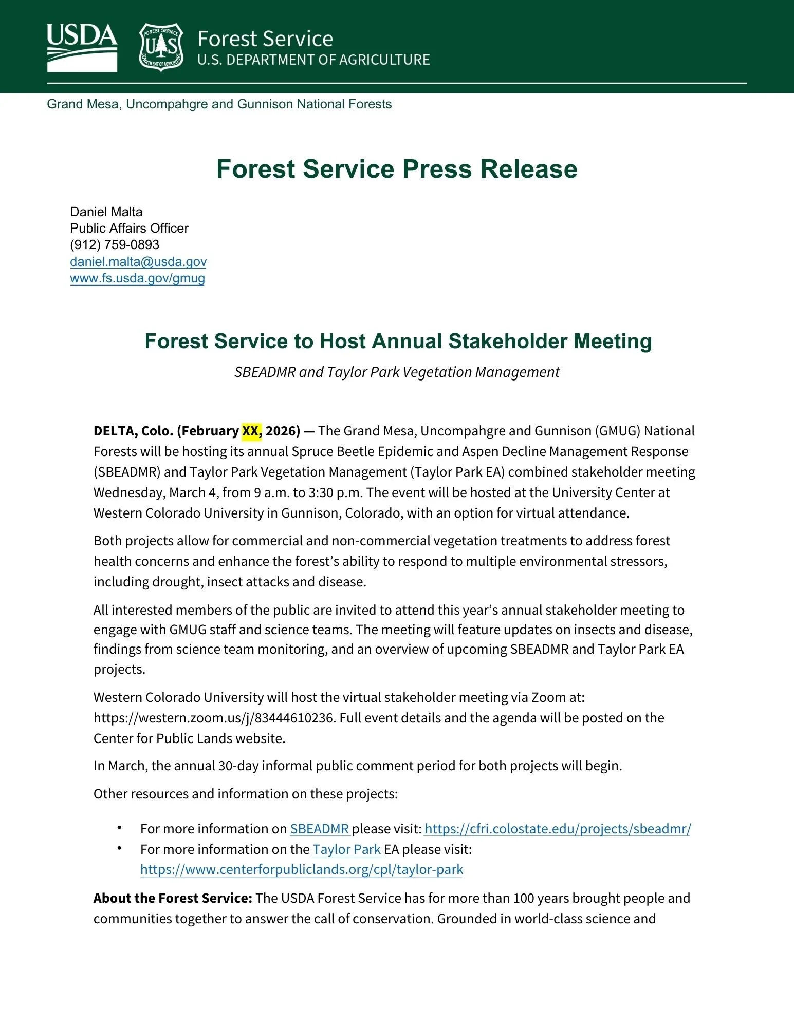 The most recent SBEADMR and Taylor Park Vegetation Management Annual Stakeholder Meeting occurred on Thursday, February 15, 2024. View presentations and/or watch the recording here!